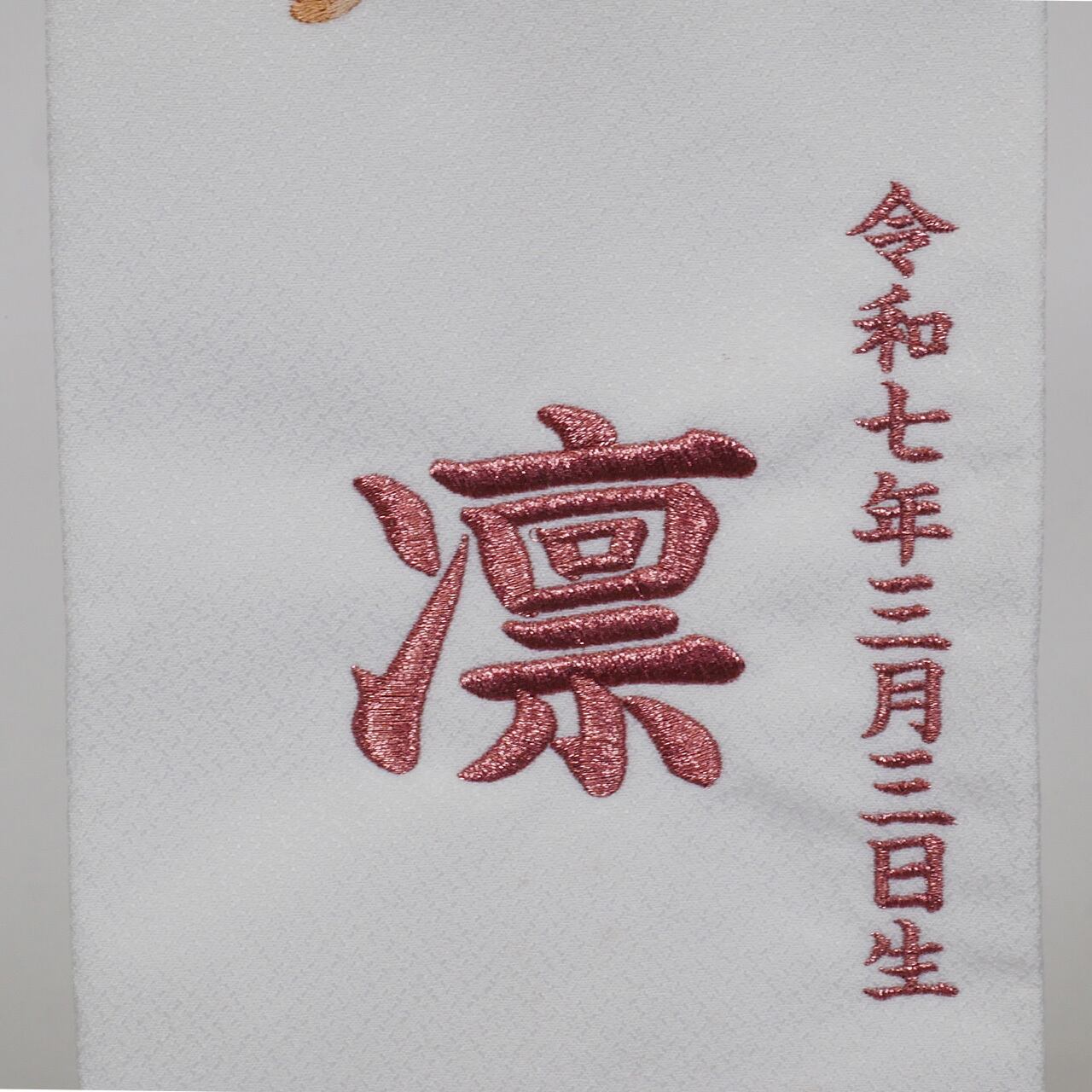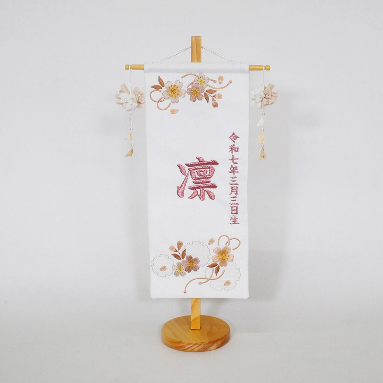 明るいアイボリーの色合いが魅力的な刺繍入り名前旗(金襴)。こちらの名前旗には、お子様のお名前が美しく刺繍されています。お祝いのシーンやご贈答品としても最適で、特別な想いを込めた一品です。お子様の成長を祝う素敵なアイテムとして、ひな人形やその他の飾り物を引き立ててくれます。
